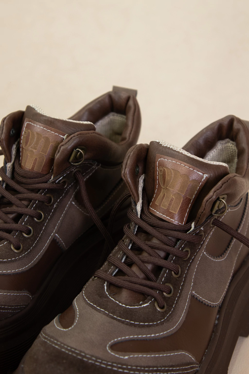 Acordonados de gamuza Pola! Con una base de goma antideslizante color beige de 5cm y una caña de 7cm. Además, tiene costuras blancas.