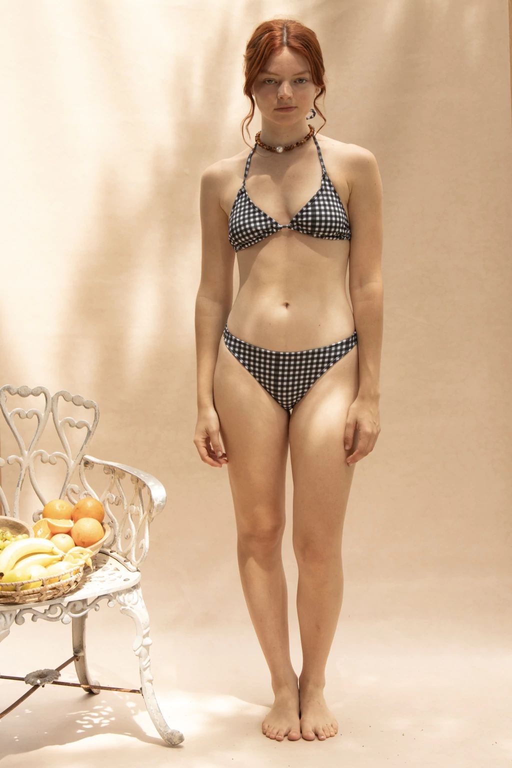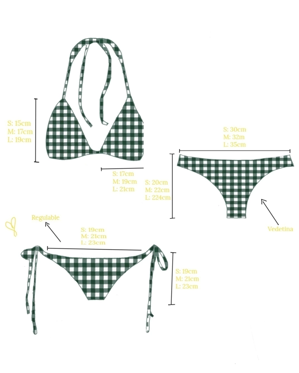 Las medidas las encontras en la ultima foto del producto. Luki está usando Talle M corpiño y S bombacha regulable
