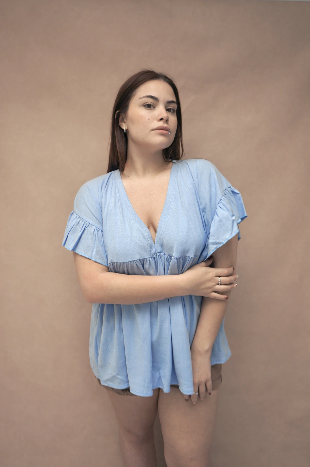 Blusa de lino, escote en V, mangas con volado y frunce debajo del busto