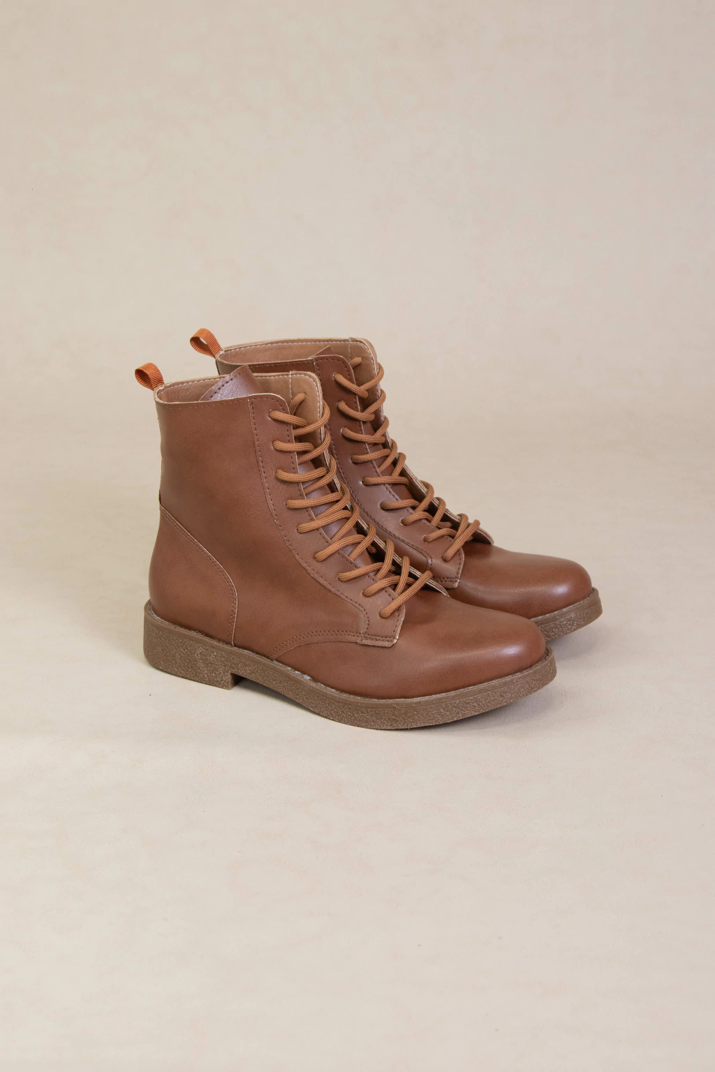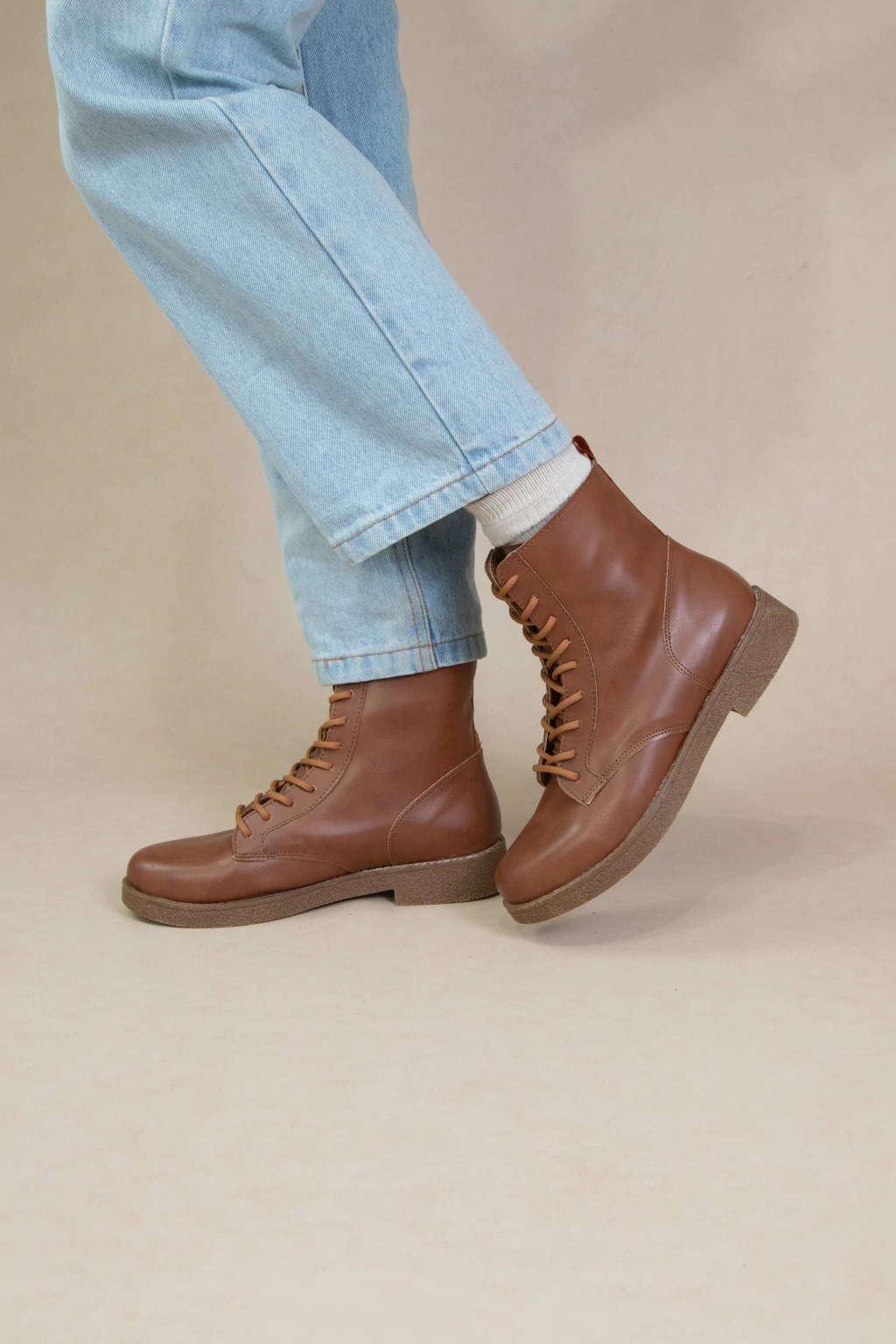 Borcegos Marlone hechos en ecocuero con cordones finos. Tiene una base baja de goma antideslizante,una caña de 14,5 cm y un taco bajo de 2,5 cm.
