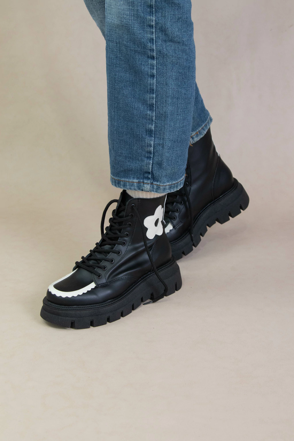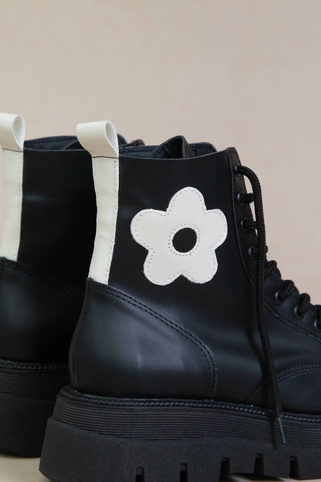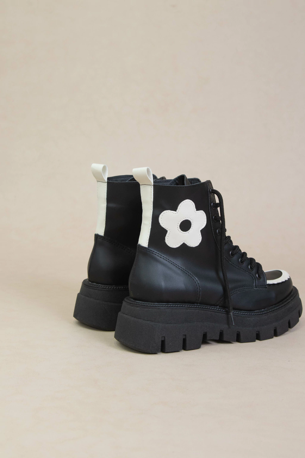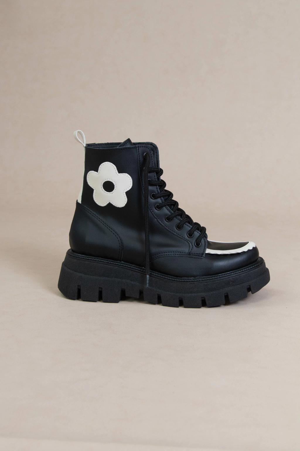 Borcegos Molly hechos en ecocuero con base de goma antodeslizante de 5cm. Tiene una caña de 13,5cm y una flor cosida.