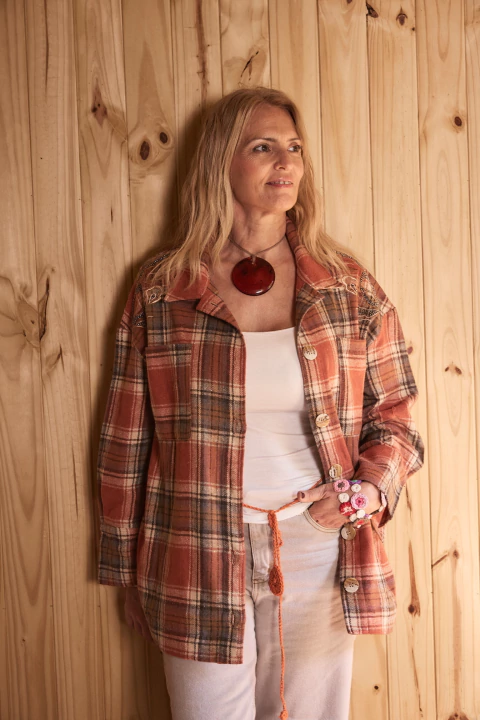 Camisaco Trento con estampa a cuadros, tiene bordado de canutillos en los hombros y botones.