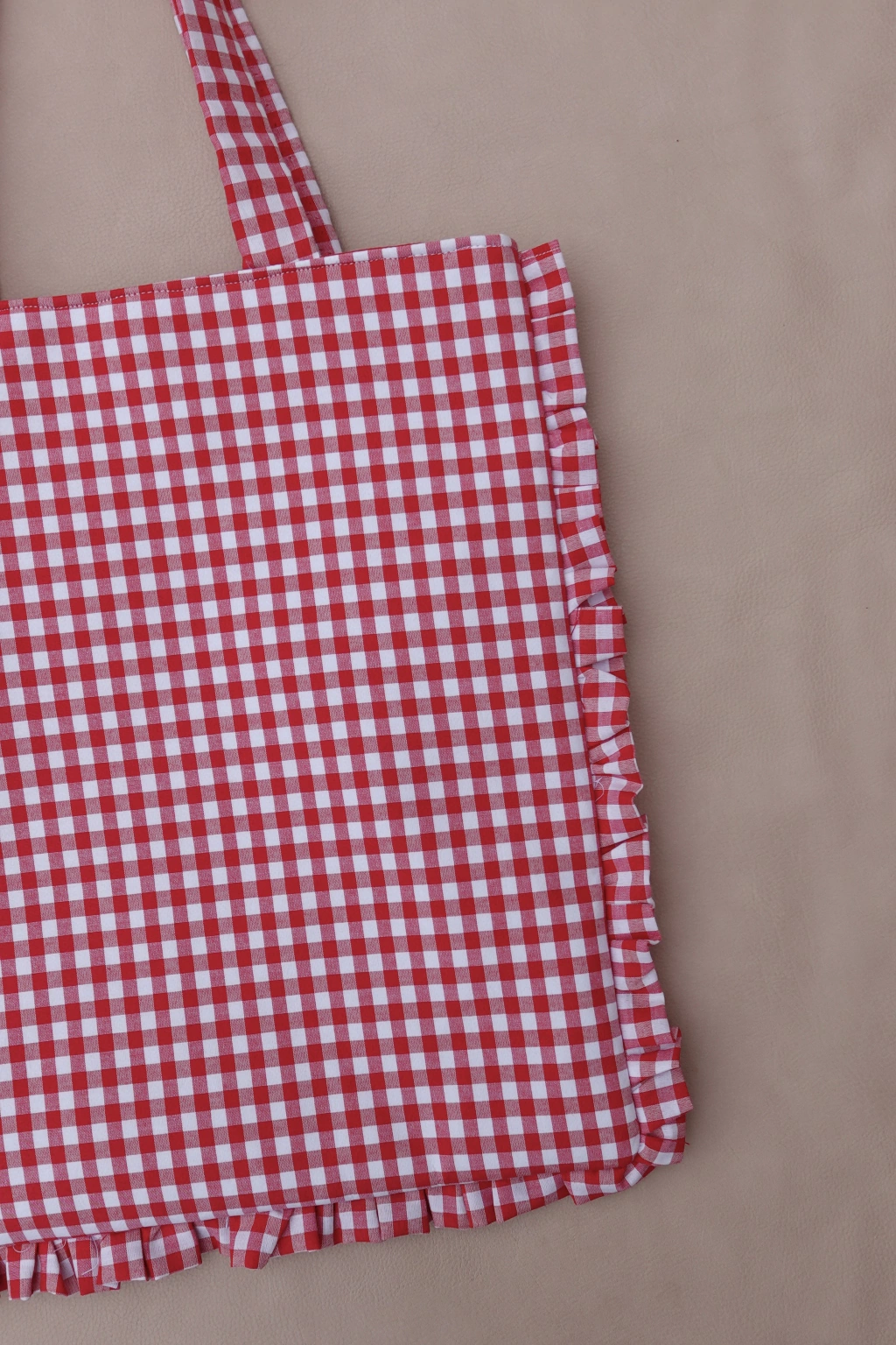 Cartera tipo tote bag con volado, tiene bolsillo interno, tira con mosquetón para colgar lo que quieras! y broche metálico para cerrar