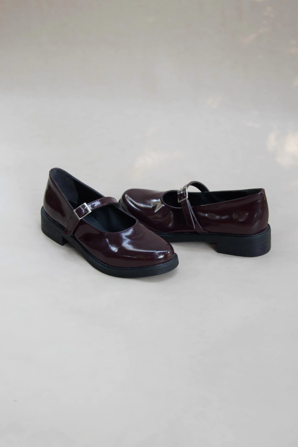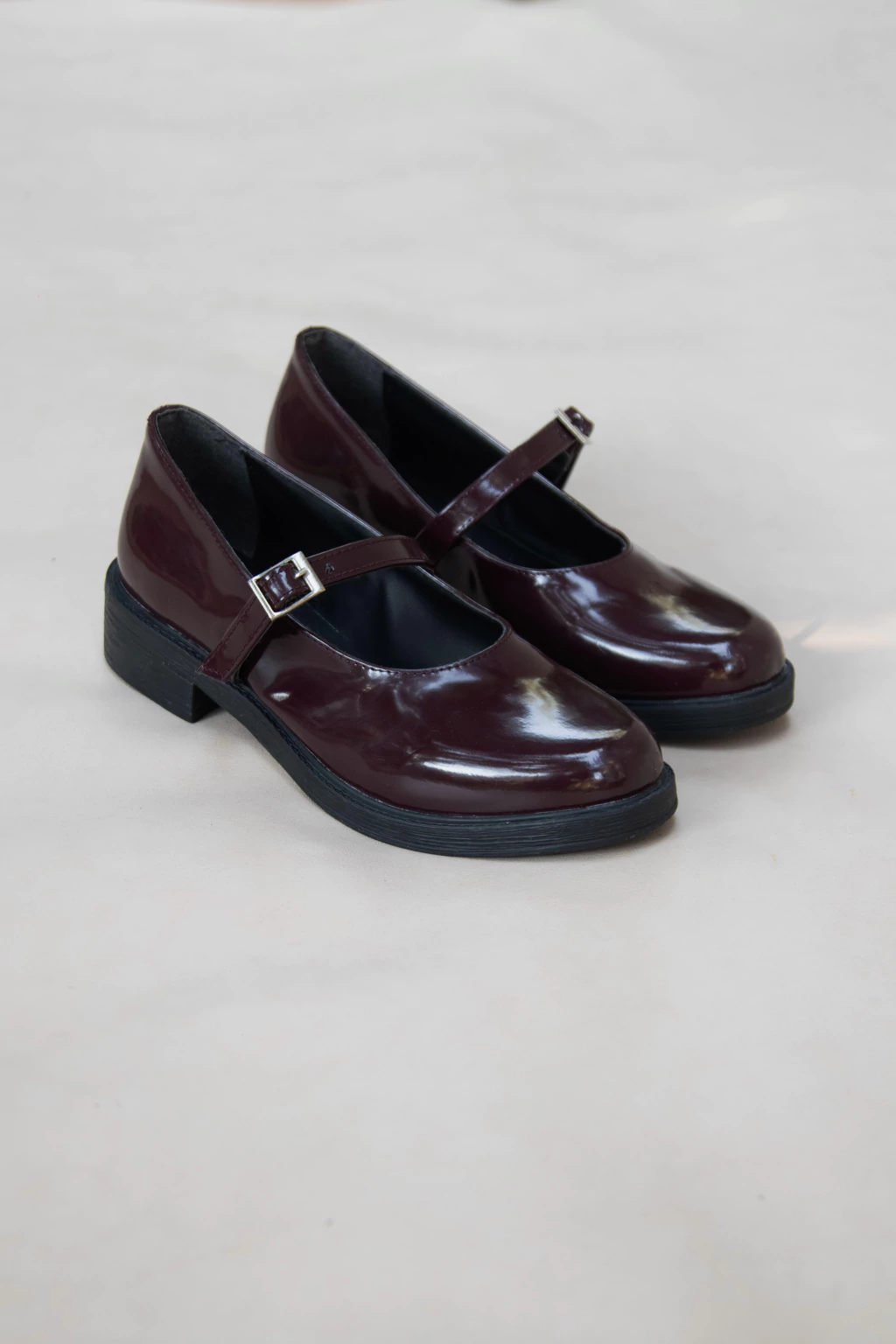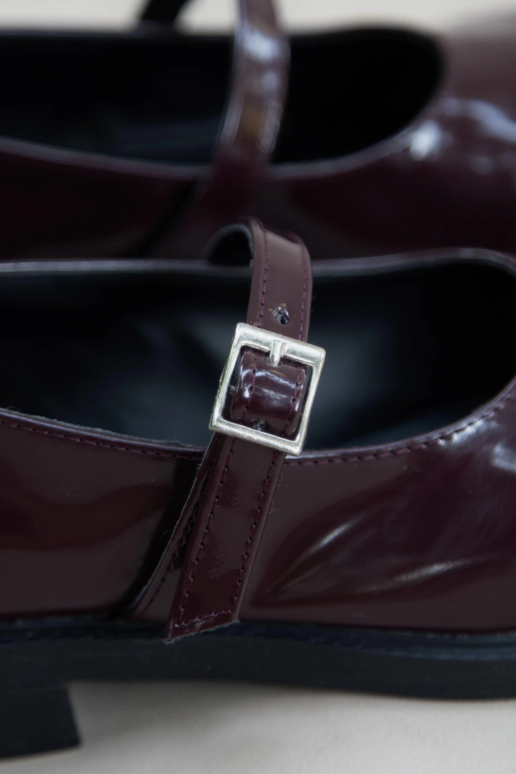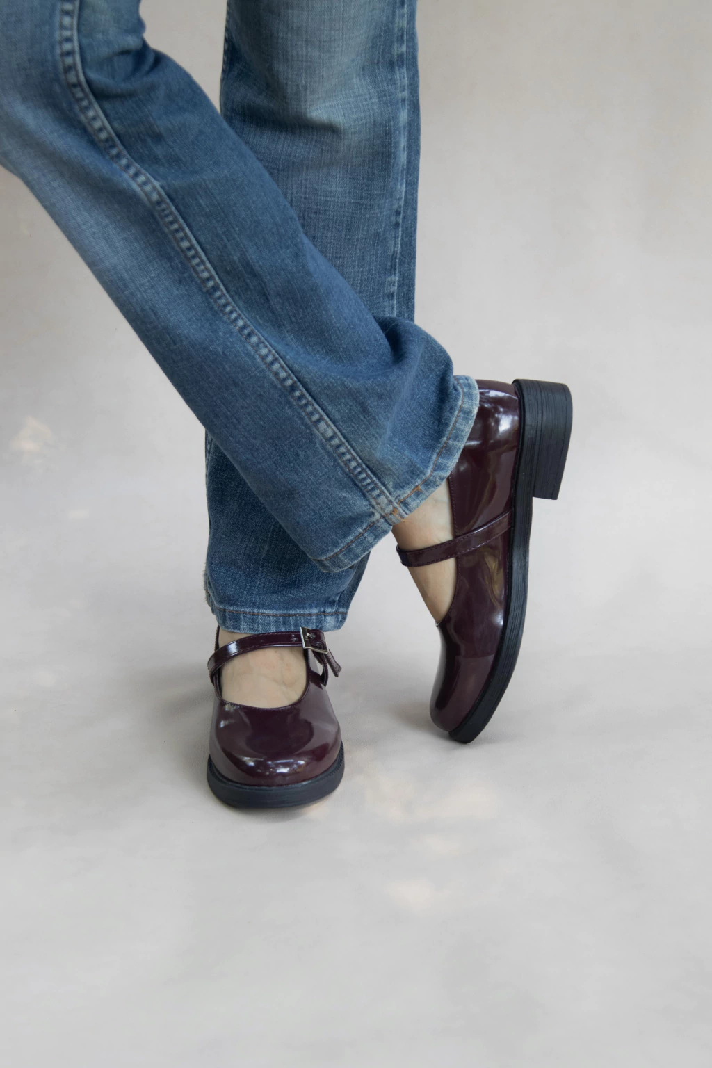 Guillerminas Amelie hechas en ecocuero Charol con una hebilla que ajusta el empeine y una base baja de goma antideslizante con un taco de 2 cm