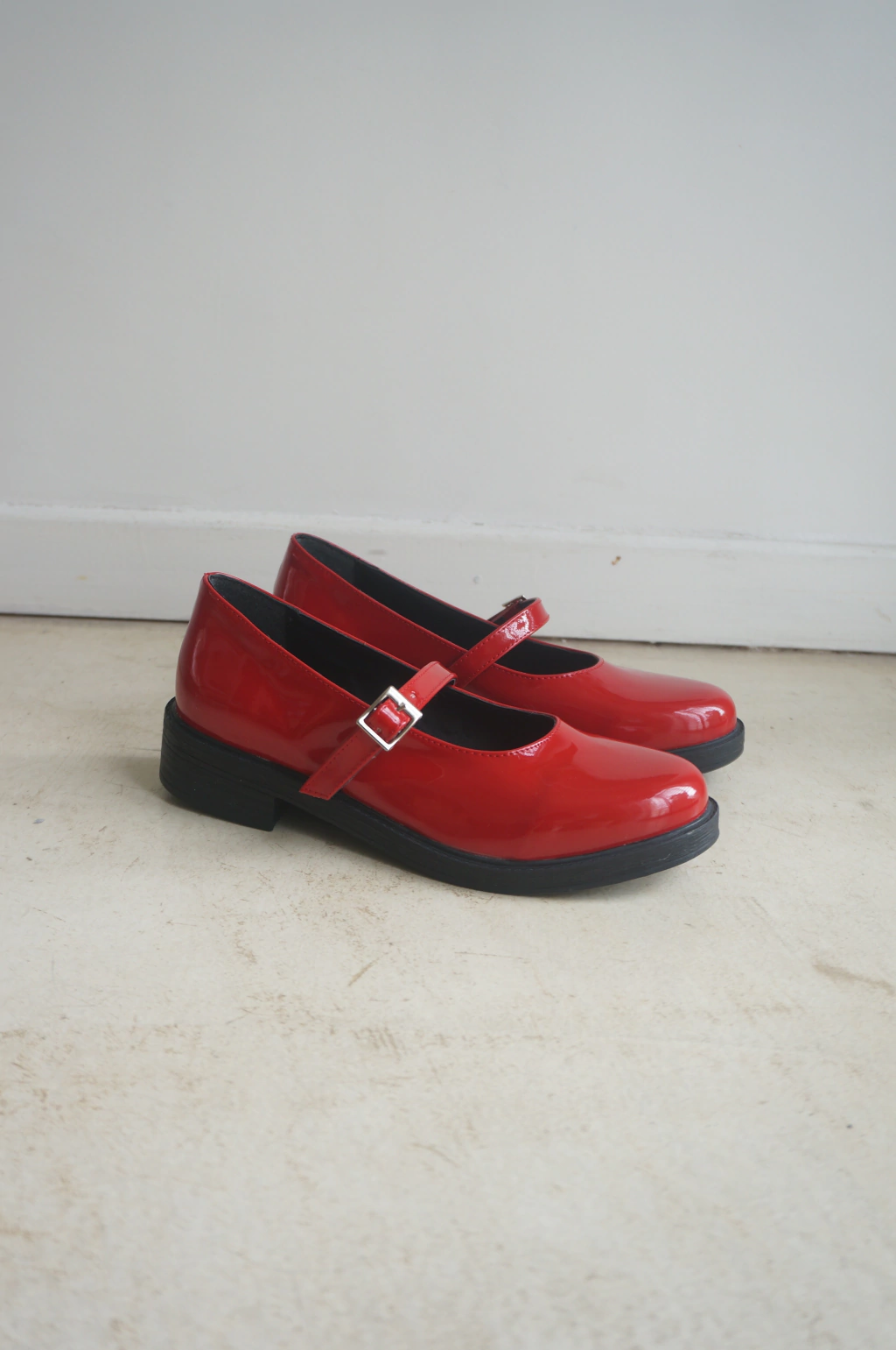 Guillerminas Amelie hechas en ecocuero Charol con una hebilla que ajusta el empeine y una base baja de goma antideslizante con 2 cm de taco.