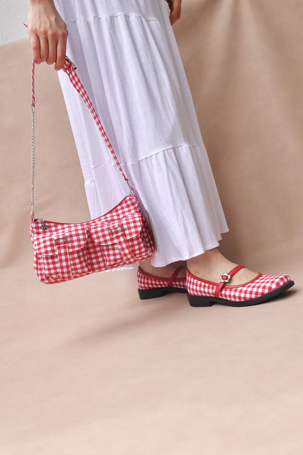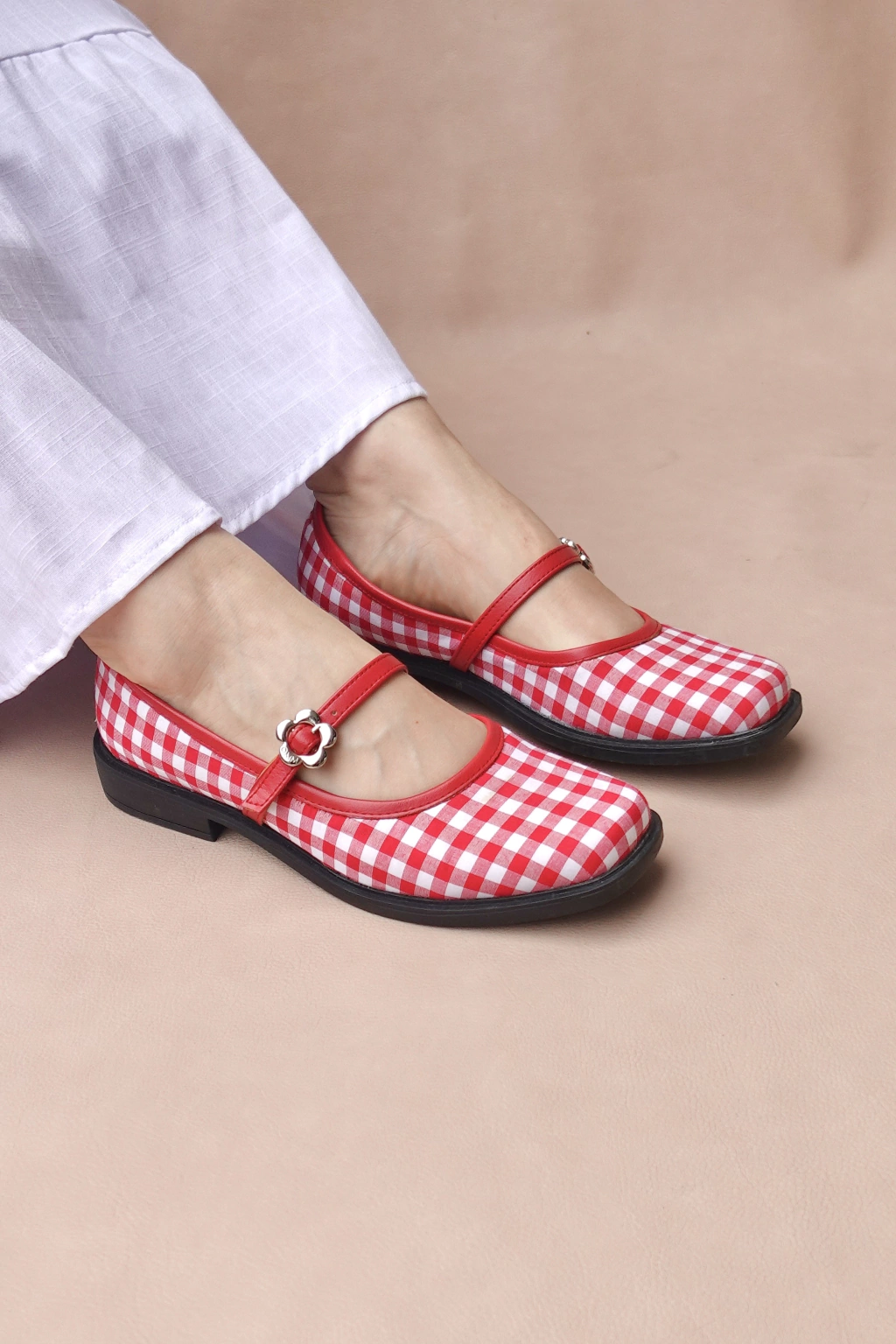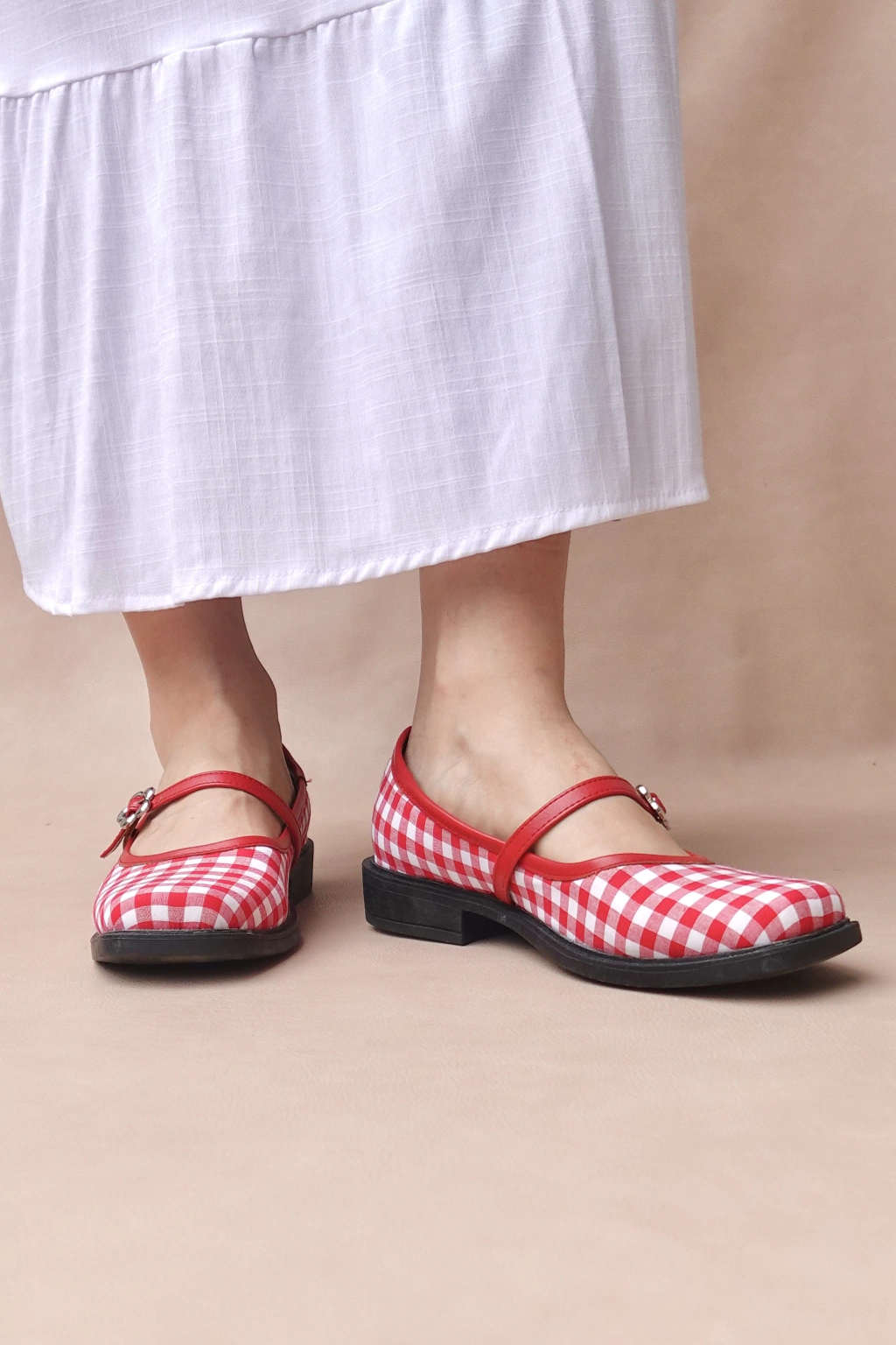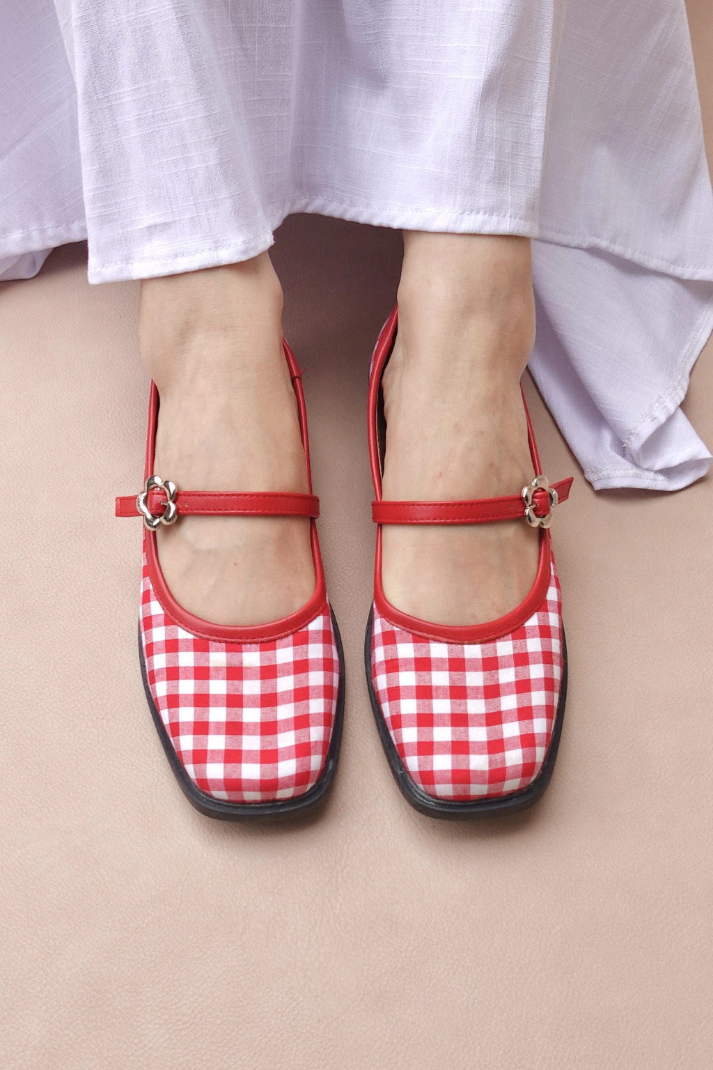 Hechas en tela cuadrilla bondeada, tiene base de goma antideslizante con punta cuadrada y taco de 2,5cm. Se ajustan en el empeine con nuestra hebilla de flor. Tienen una horma normal es por eso que recomendamos pedir el talle que usas normalmente! Les dejamos la tabla de talles en las fotos del producto
