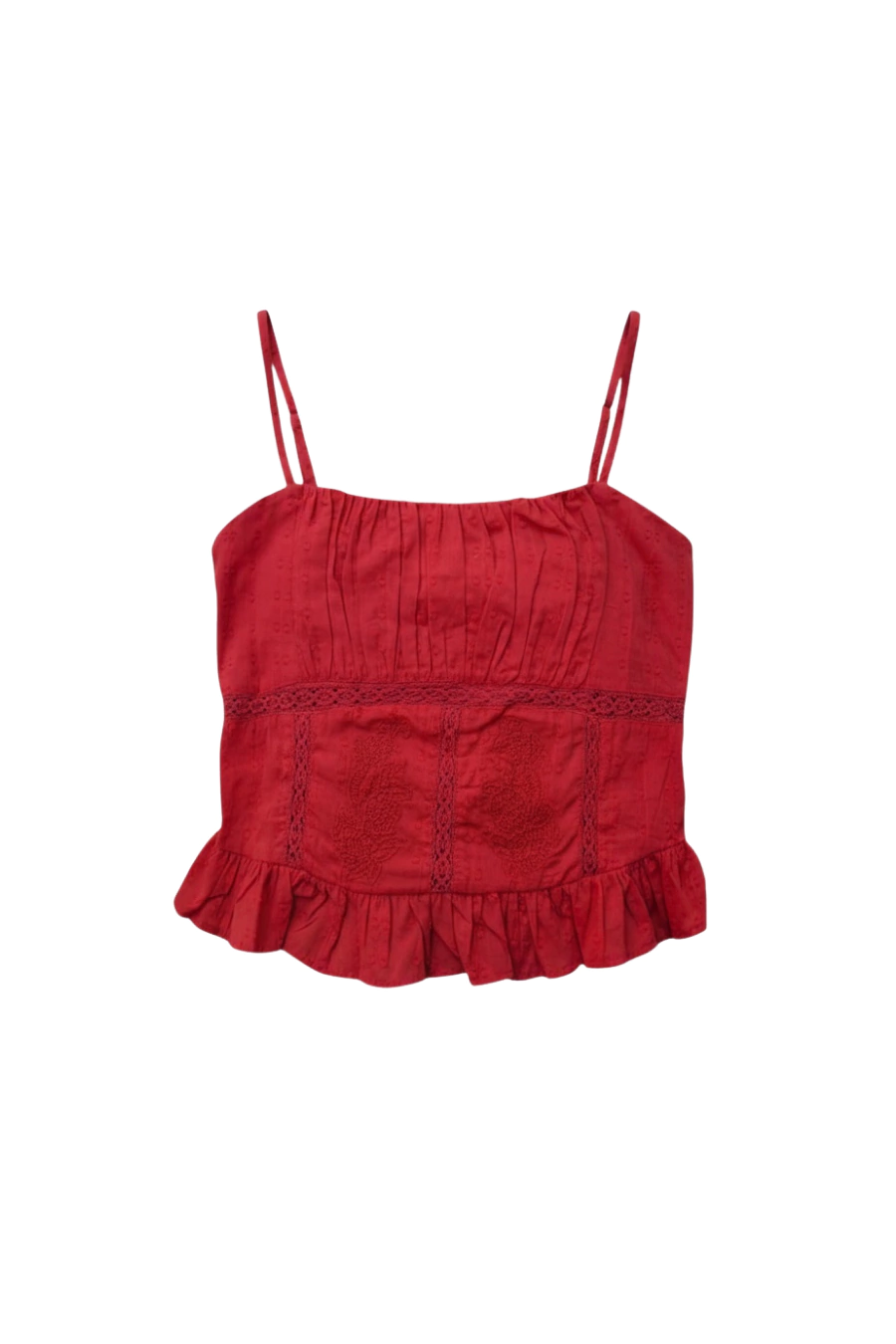 Musculosa bordada sin mangas. Tiene volados en el bajo y bordado en el frente.