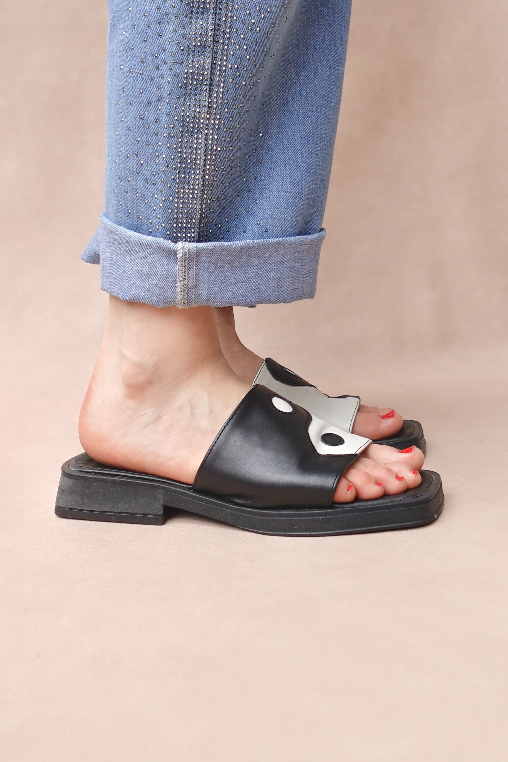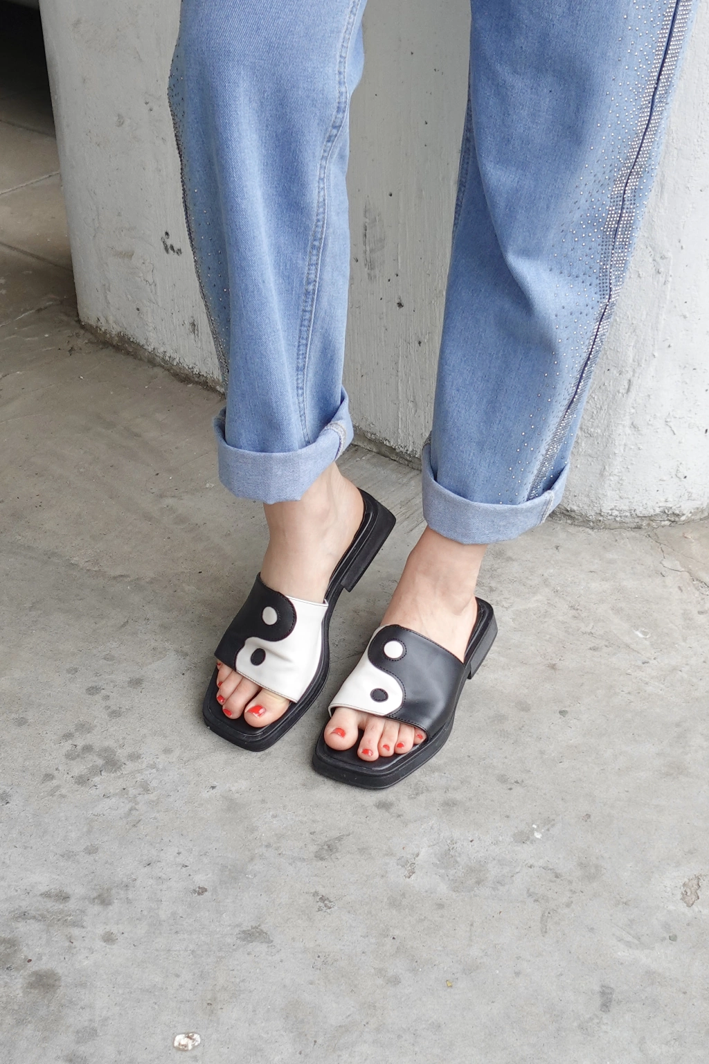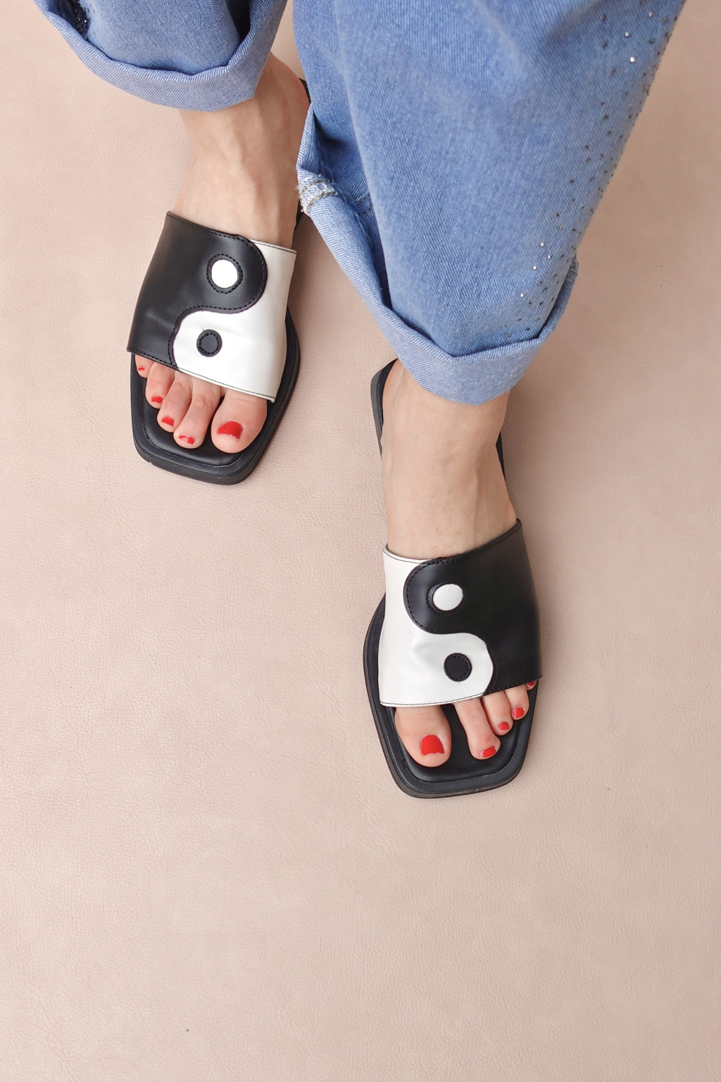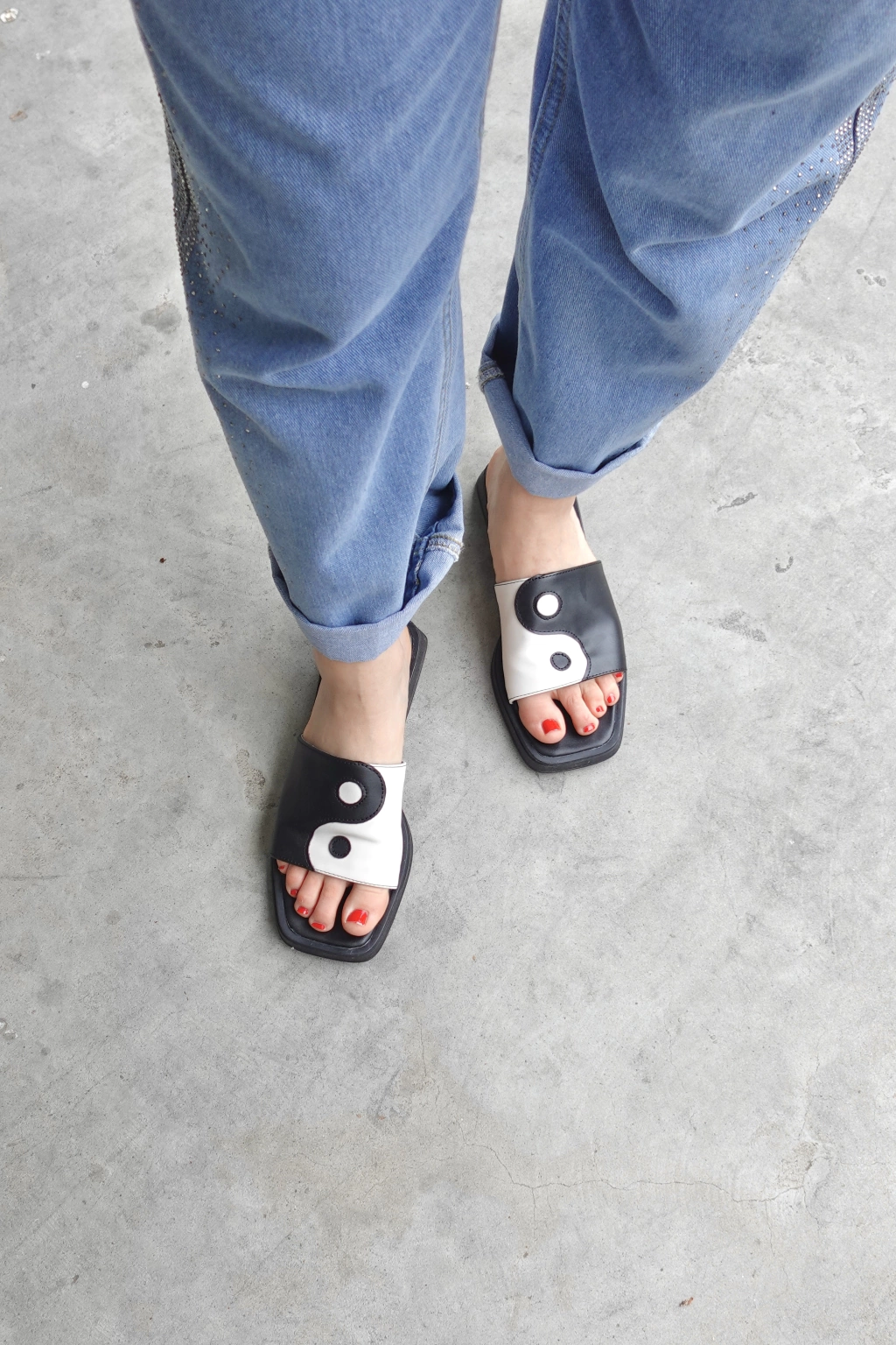 Hechas en ecocuero. Tienen una faja con forma de yin yang. La base es de goma antideslizante con un taco bajo de 3cm🌸