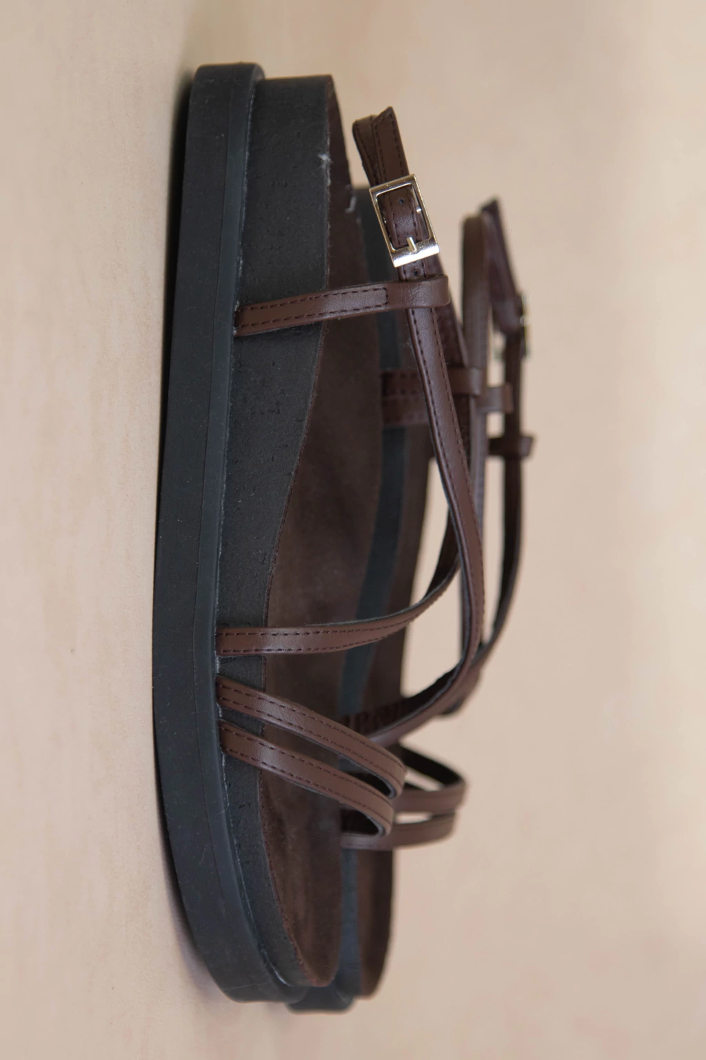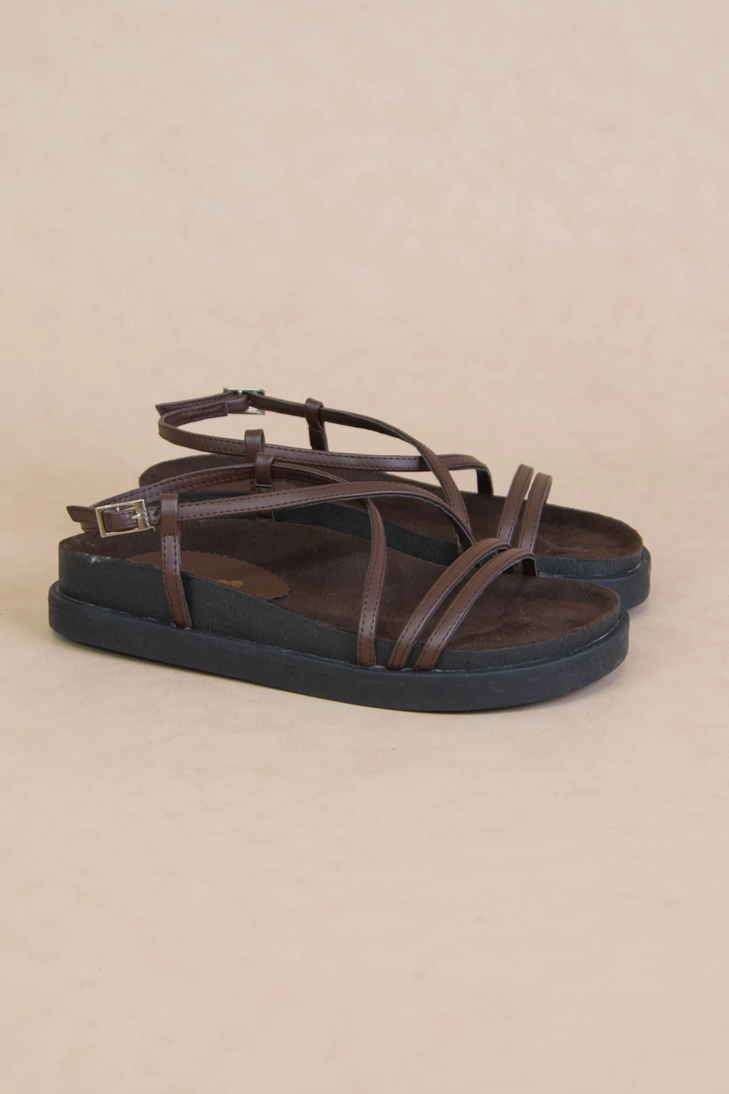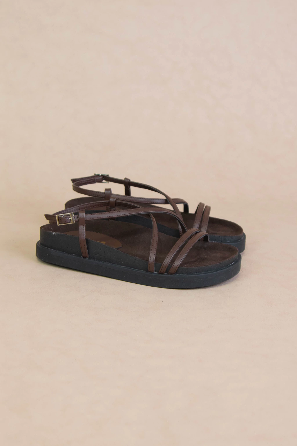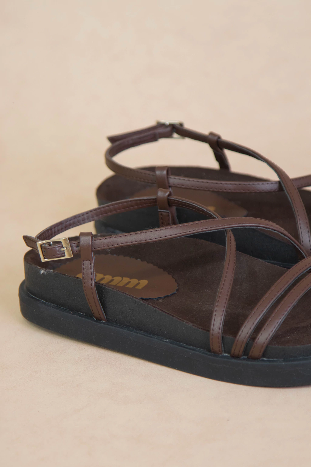 Sandalias Anita hechas en ecocuero con tiras finas que cruzan y agarran el pie. Tiene base gomon con plantilla forrada.