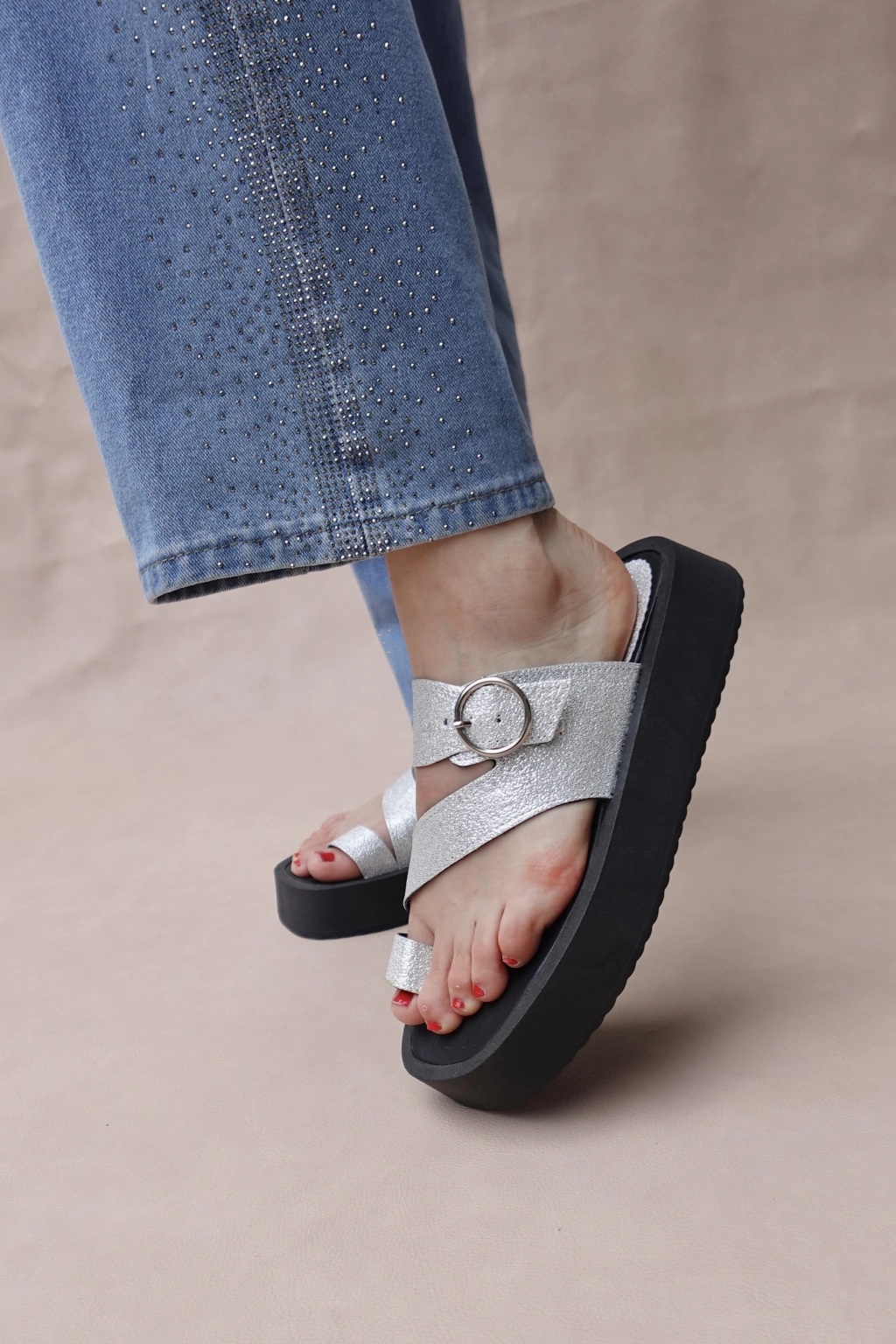 Hechas en ecocuero, tiene hebilla redonda para regular en el empeine. Tienen base de goma antideslizante de 4cm. Tienen una horma normal es por eso que recomendamos pedir el talle que usas normalmente! Les dejamos la tabla de talles en las fotos del producto