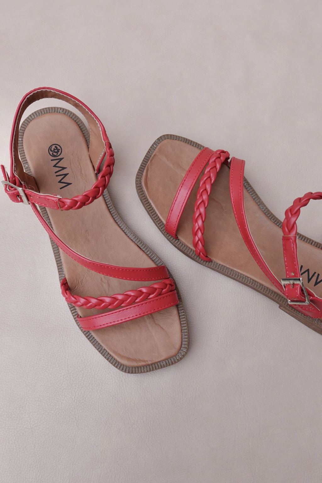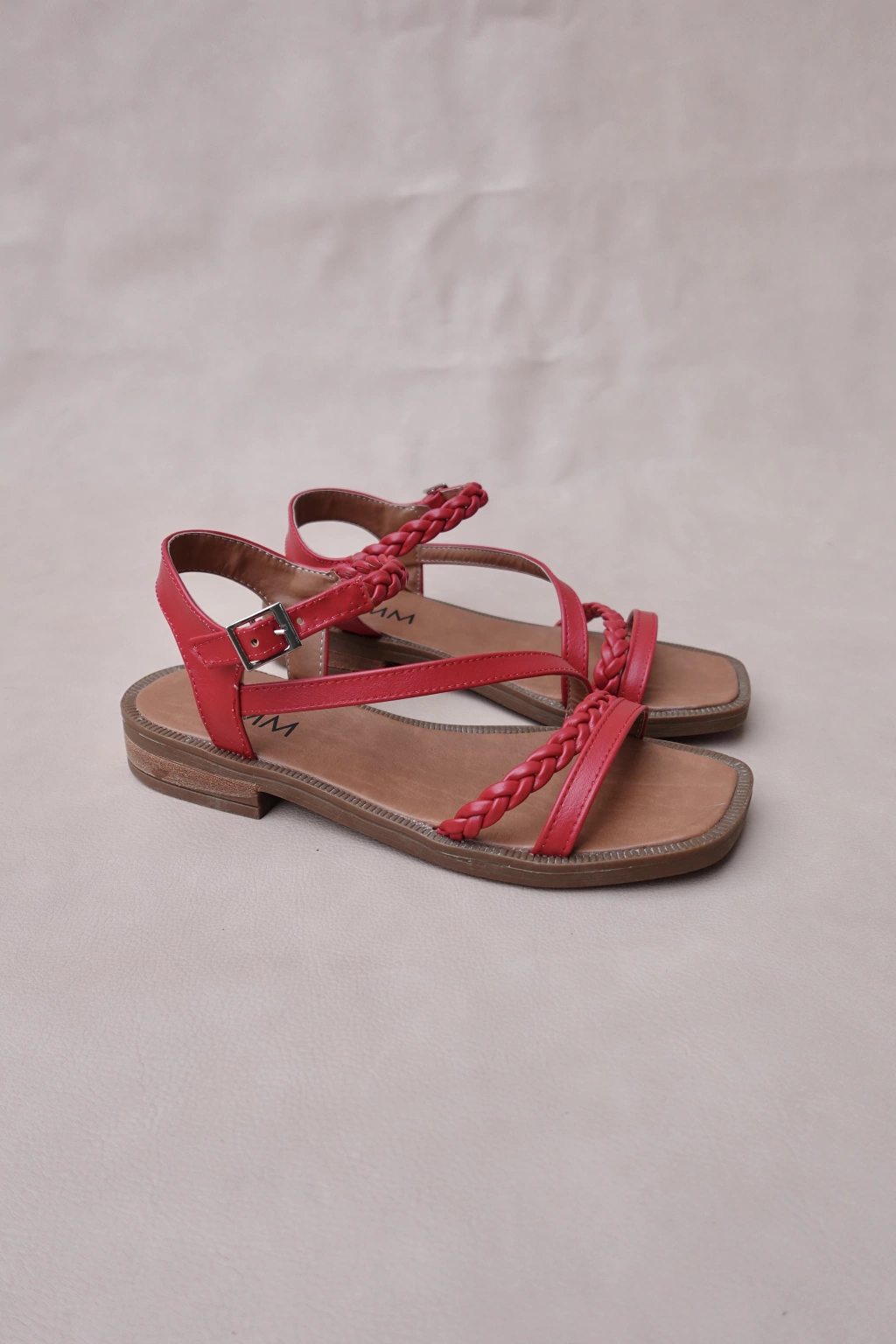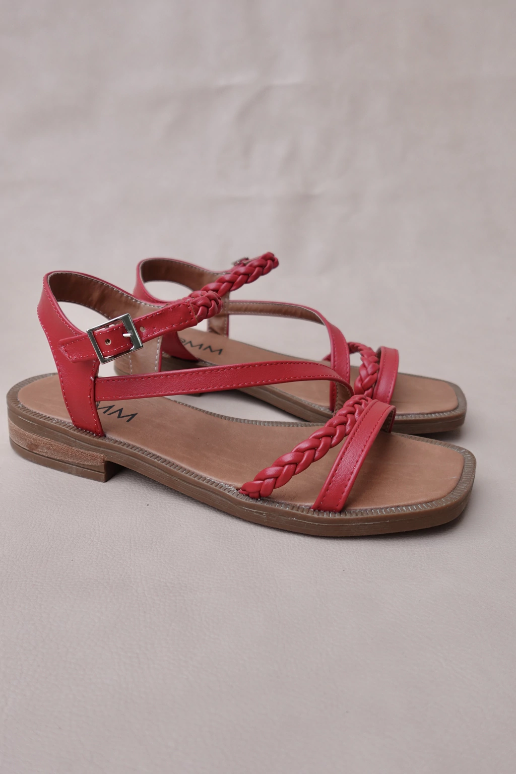 Hechas en ecocuero con tiras que cruzan y una trenza. Tienen base de goma antideslizante con taco de folia y punta cuadrada. Tienen una horma normal es por eso que recomendamos pedir el talle que usas normalmente! Les dejamos la tabla de talles en las fotos del producto