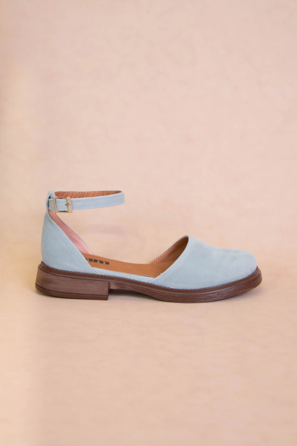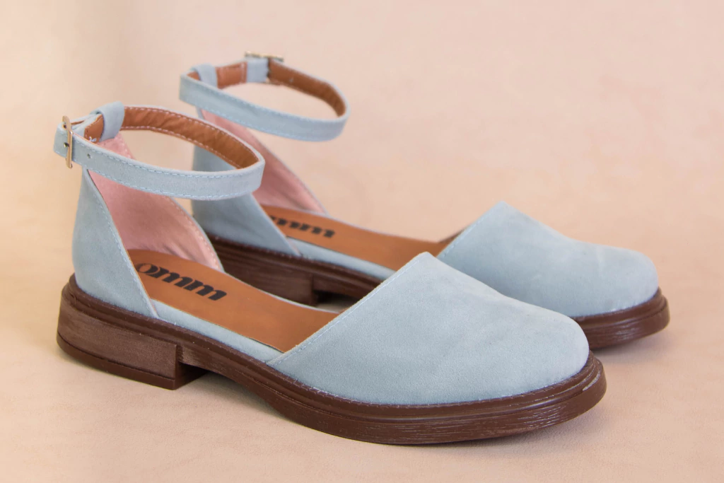 Con un taco bajito de 2,5cm. Tiene una parte cubierta en el empeine y parte del talón, con una tira para ajustar en el mismo.