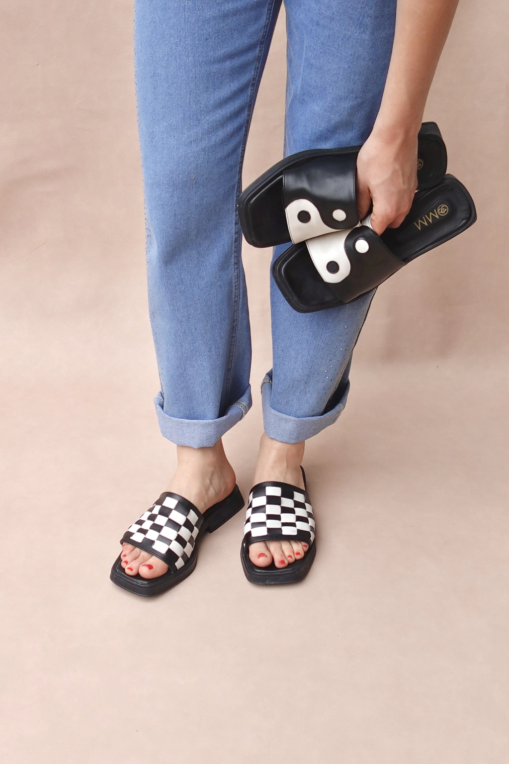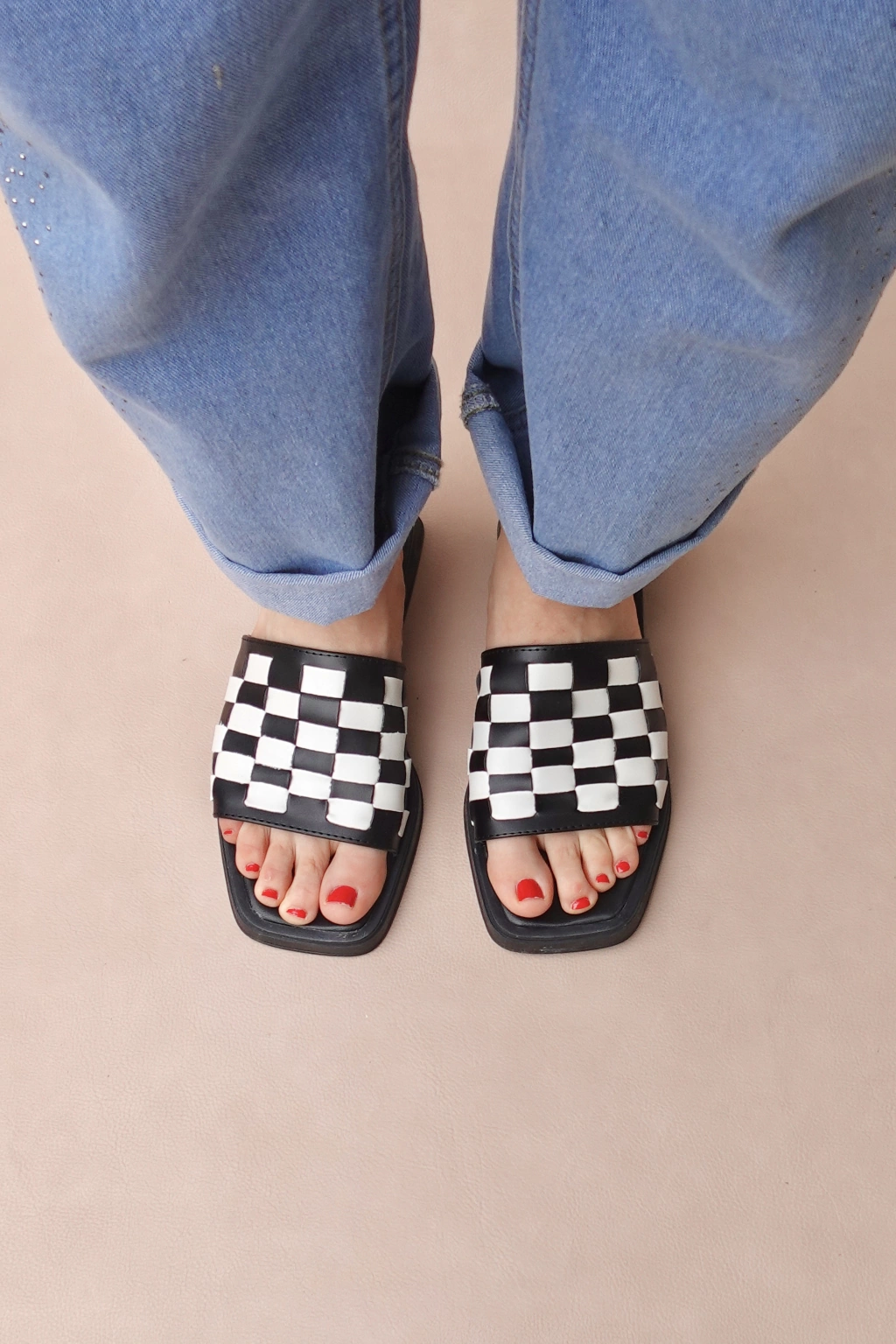 Hechas en ecocuero. Tienen una faja de a cuadros combinada con hueso. La base es de goma antideslizante con un taco bajo de 3cm🌸