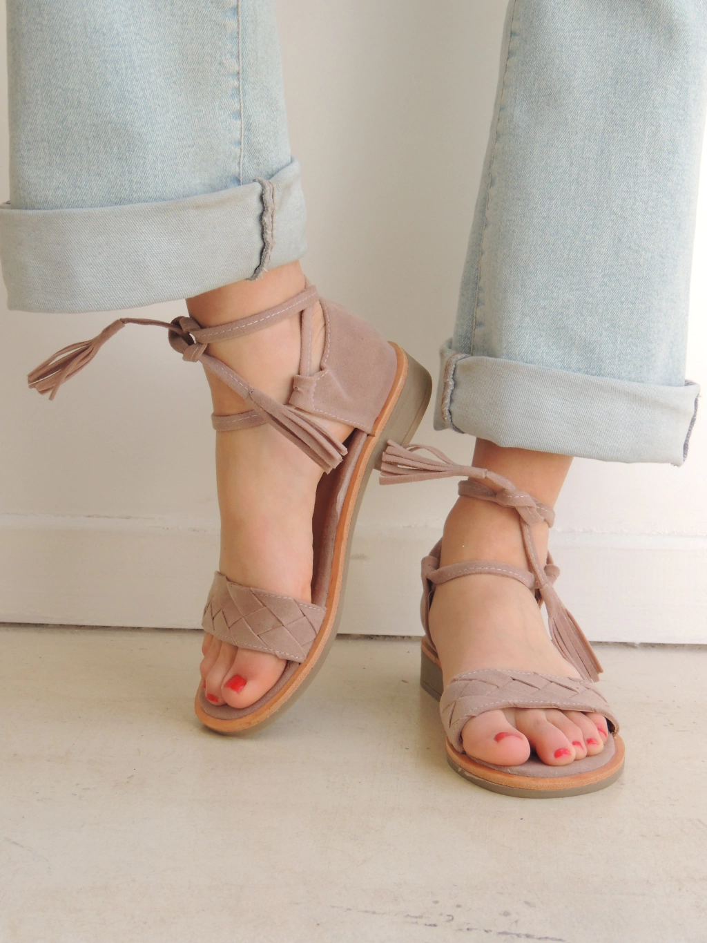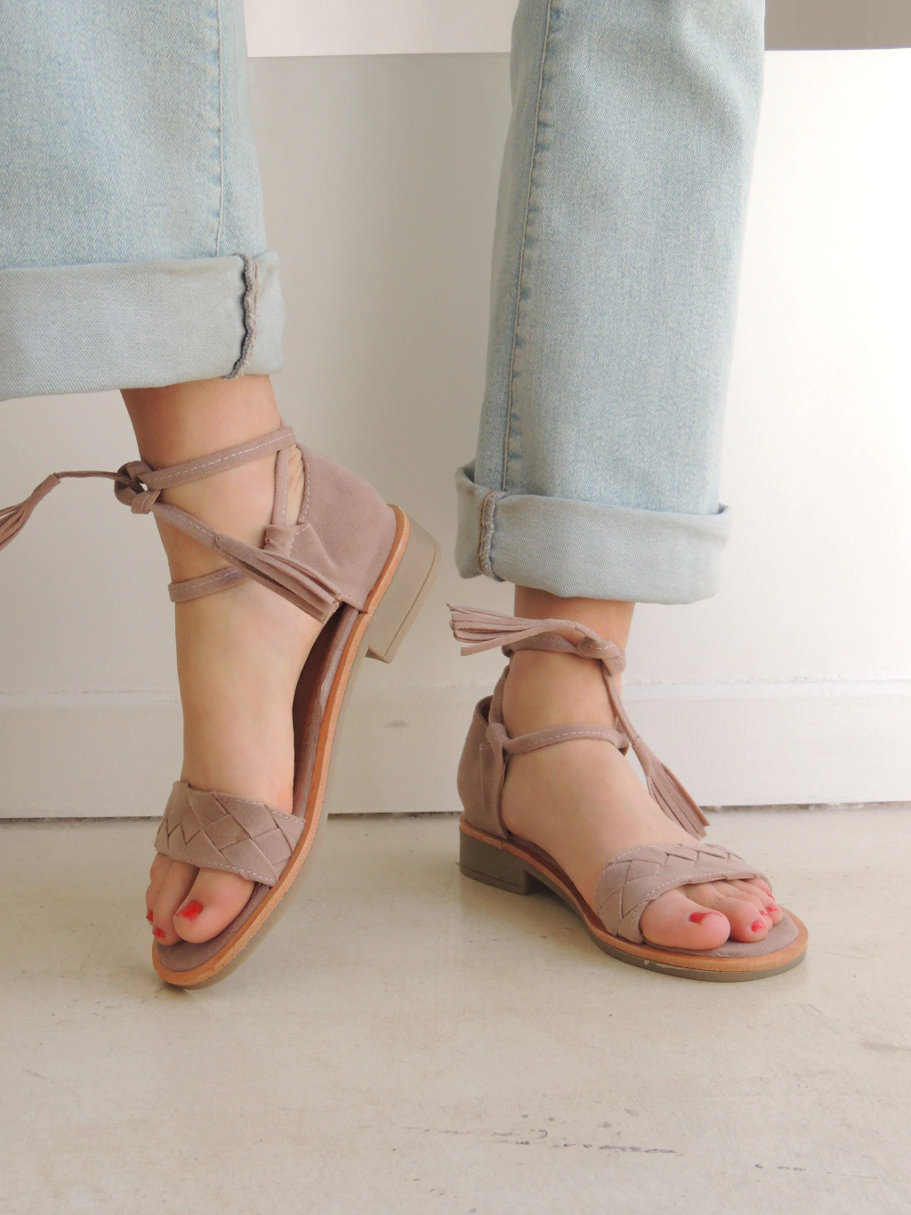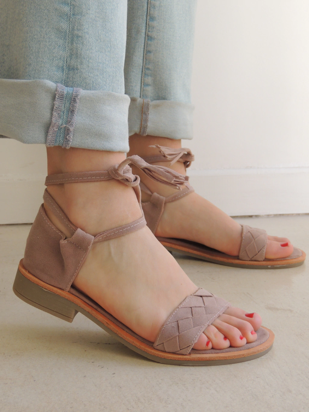 Hechas en ecocuero gamuza. Tiene una tira trenzada y una talonera con tiras para atar en el tobillo con detalle de pompones en la punta. Tienen una base de goma antideslizante con un taco bajo de 2,5cm.