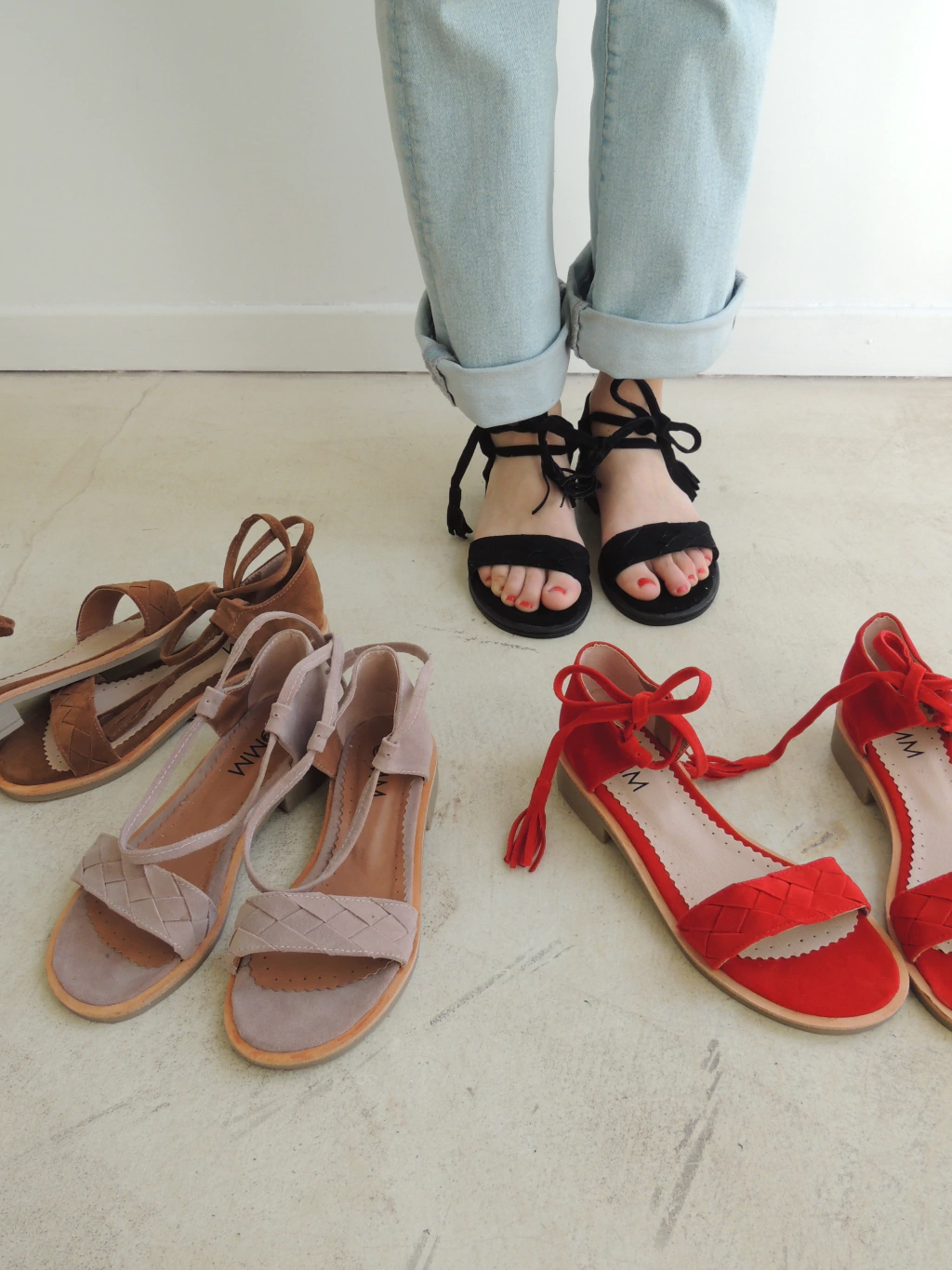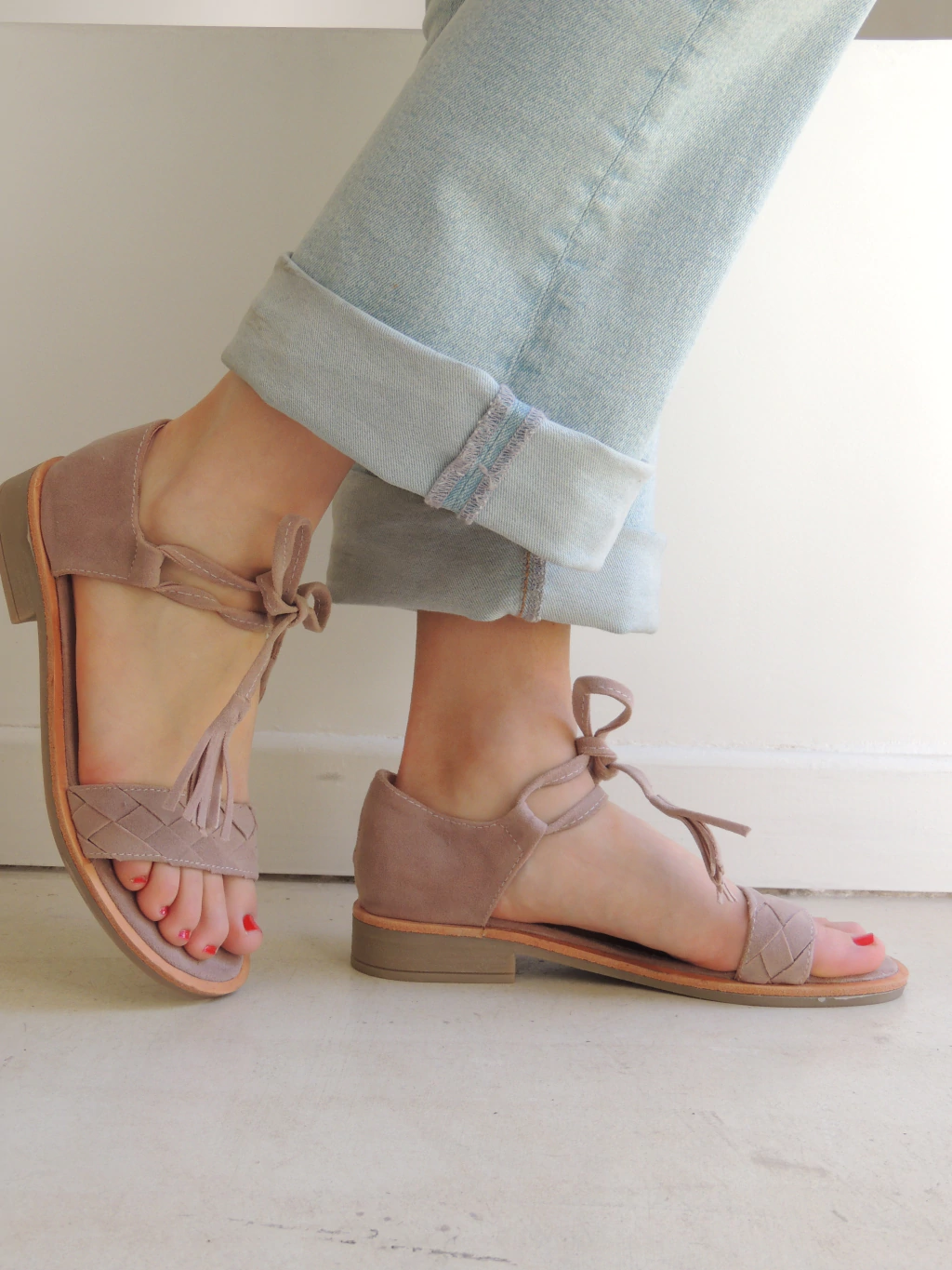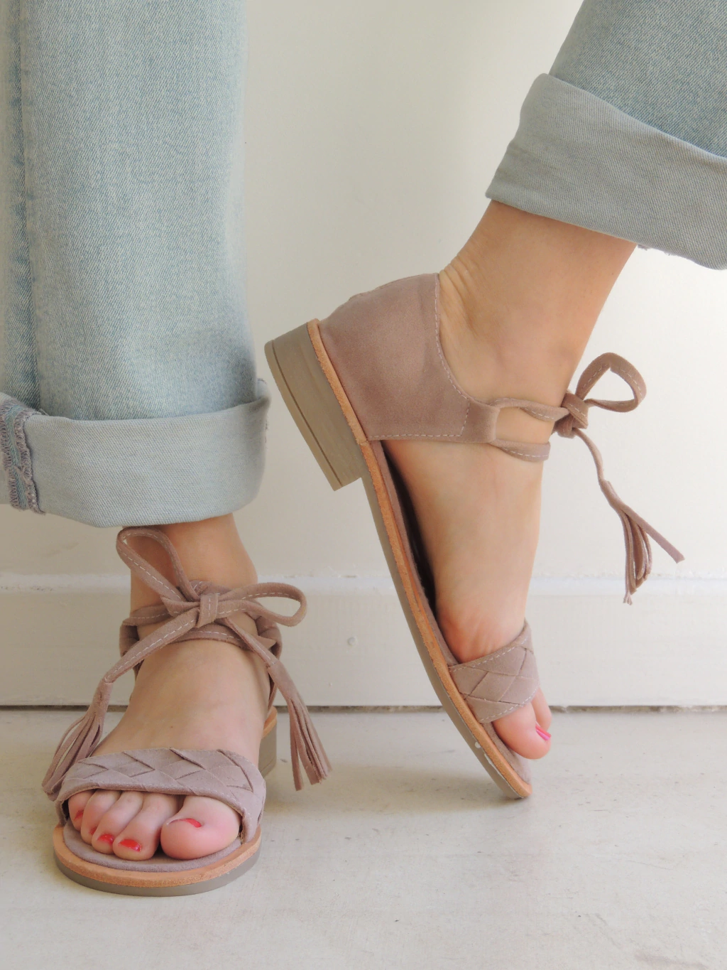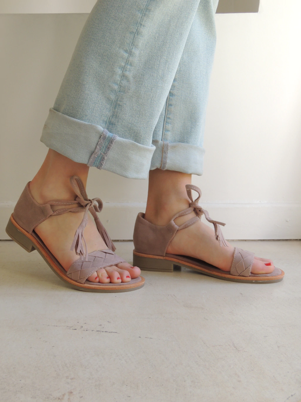 Hechas en ecocuero gamuza. Tiene una tira trenzada y una talonera con tiras para atar en el tobillo con detalle de pompones en la punta. Tienen una base de goma antideslizante con un taco bajo de 2,5cm.