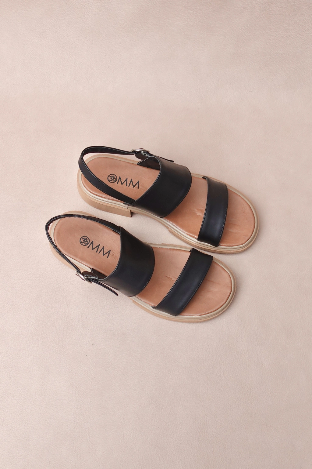 Hechas en ecocuero. Con una base de goma antideslizante color camel. Tiene dos fajas con una hebilla que ajusta en el tobillo.