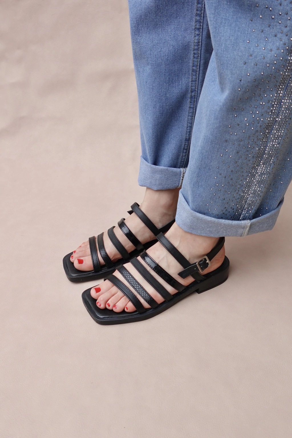Sandalias. Hechas en ecocuero. Con base de goma antideslizante con taco de 2cm y punta cuadrada. Tiene cuatro tiras con distintos ecocuero