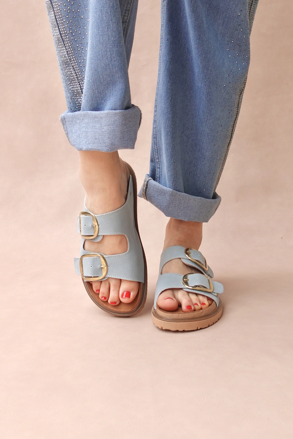 Hechas en ecocuero. Estilo birk con dos hebillas doradas y una base de goma antideslizante.