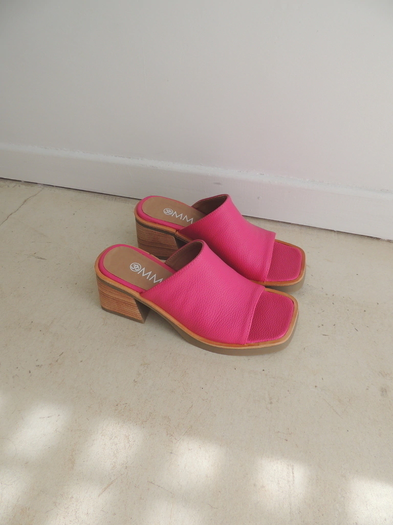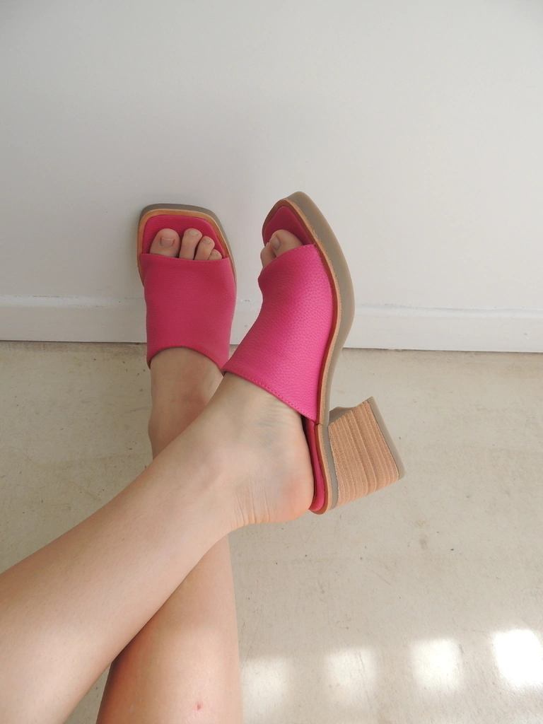 Hechas en ecocuero. Con una base de goma antideslizante con taco y folia. Tiene punta cuadrada y una faja.