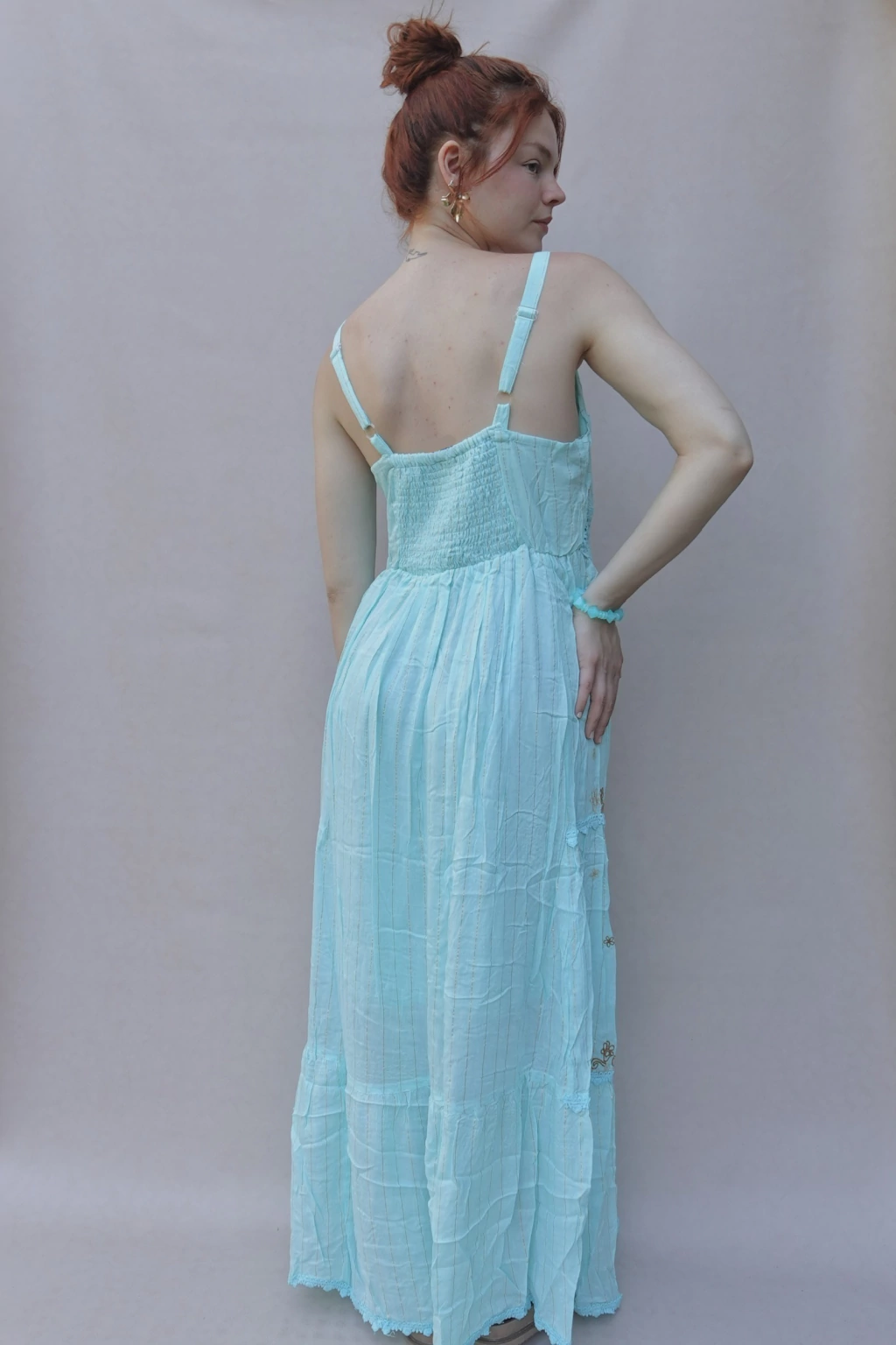 Vestido bordado importado de la India, musculosa con tira regulable, tiene elastico en la espalda y cordon en la cintura para ajustar. Tiene detalles en dorado en toda la tela